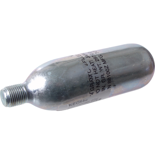 Used with the Torpedo Mini CO2 Regulator. One canister will push between 1-4 five gallon Cornelius style homebrew kegs, depending on how it is used and the CO2 consumption required.