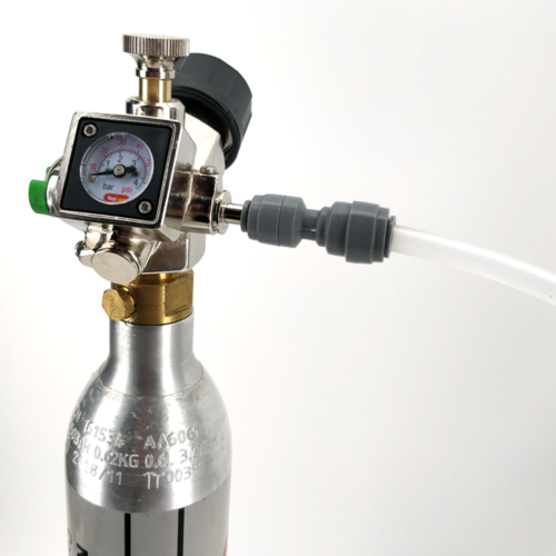 The gas outlet can be swapped between a female flare connection for flare ball lock disconnects and a 6.5mm Duotight-compatible barb for use with draft line. The barb is a great option for dispensing commercial kegs. There are also two potential outlets at either the side or the front of the regulator. This makes it easy to orient the regulator depending on whether you're using plastic or stainless steel ball lock disconnects.