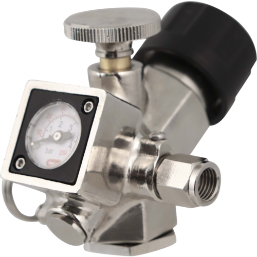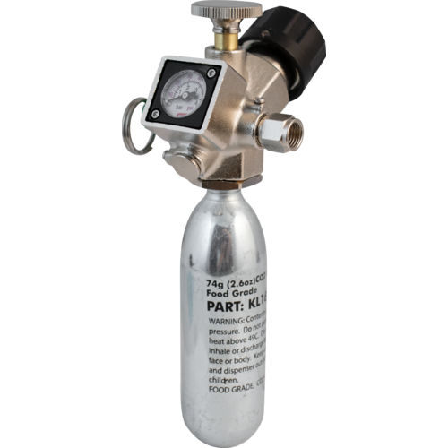 The heavy-duty chrome-plated solid cast brass body will stand up to years of abuse, and is well-suited to protect the mini pressure gauge. A unique 2-step cartridge installation process results in zero gas loss. First the cartridge is fully threaded into the unit to form a seal before it's opened, then the actuator pin is threaded down to puncture the cartridge and release gas into the regulator. The included bushing adapter is ready to accept 16g 3/8"-24 UNF threaded cartridges, and with a simple adapter you can switch to 74-gram 5/8"-18 UNF threaded cartridges.